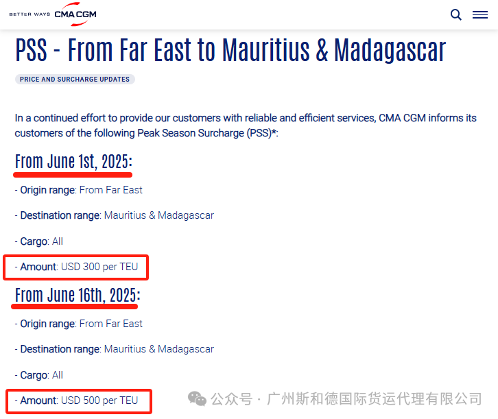 CMA CGM Levies Pss ສໍາລັບ Mauritius / Madagascar