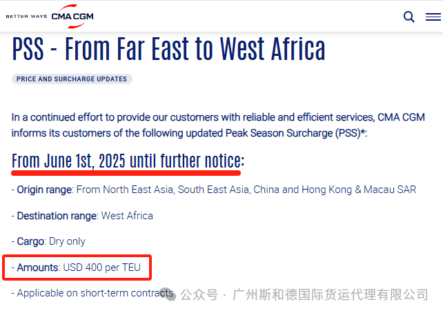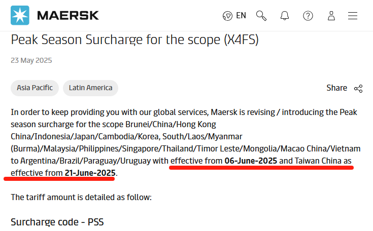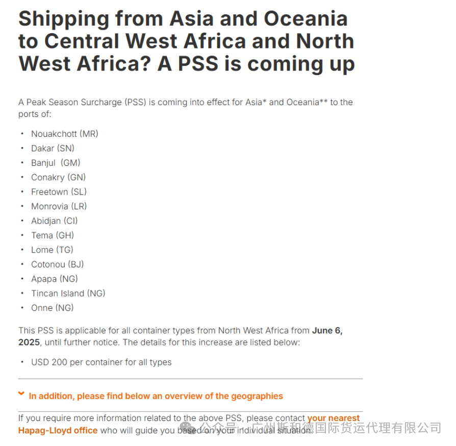 ມື້ນີ້ Hapag-Lloyd ໄດ້ປະກາດການບັງຄັບໃຊ້ໃນລະດູການລະດູການສູງສຸດ (Pss) 200 / TEU ແຕ່ຕົ້ນເດືອນມິຖຸນາ 19, 2025 ຫາ Ports ໃນອາຟຣິກາ.