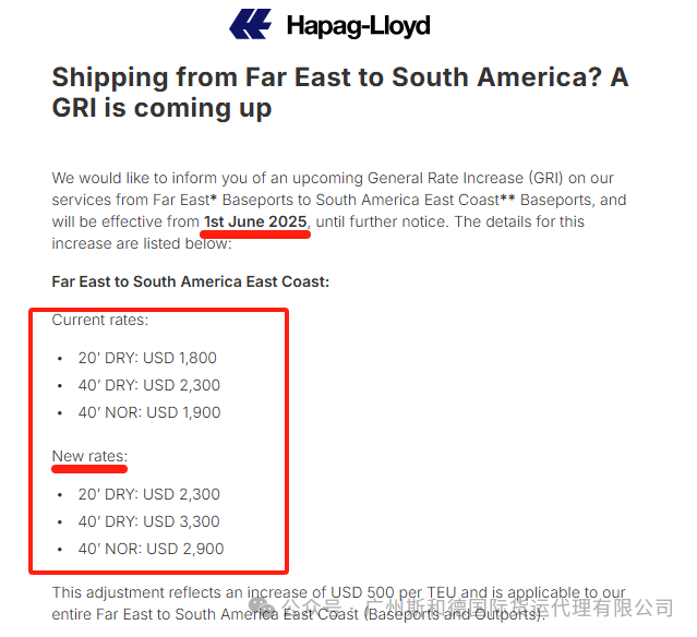 Hapag-lloyd ໄດ້ປະກາດວ່າມັນຈະເພີ່ມ Grri ຈາກຕາເວັນອອກໄກເຖິງອາເມລິກາໃຕ້ແຕ່ວັນທີ 1 ມິຖຸນາ, 2025 ຈົນເຖິງການແຈ້ງການເພີ່ມເຕີມ.
