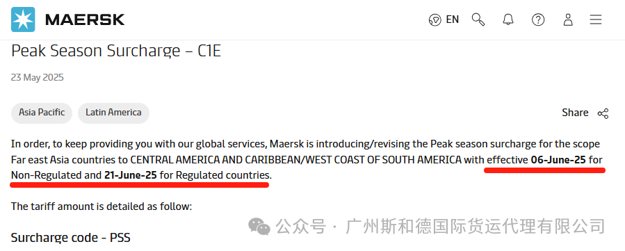 MSK Levies PSS ຈາກຕາເວັນອອກໄກໄປທີ່ສູນກາງອາເມລິກາກາງແລະຊາຍຝັ່ງທະເລ Caribbean / West ຂອງອາເມລິກາໃຕ້